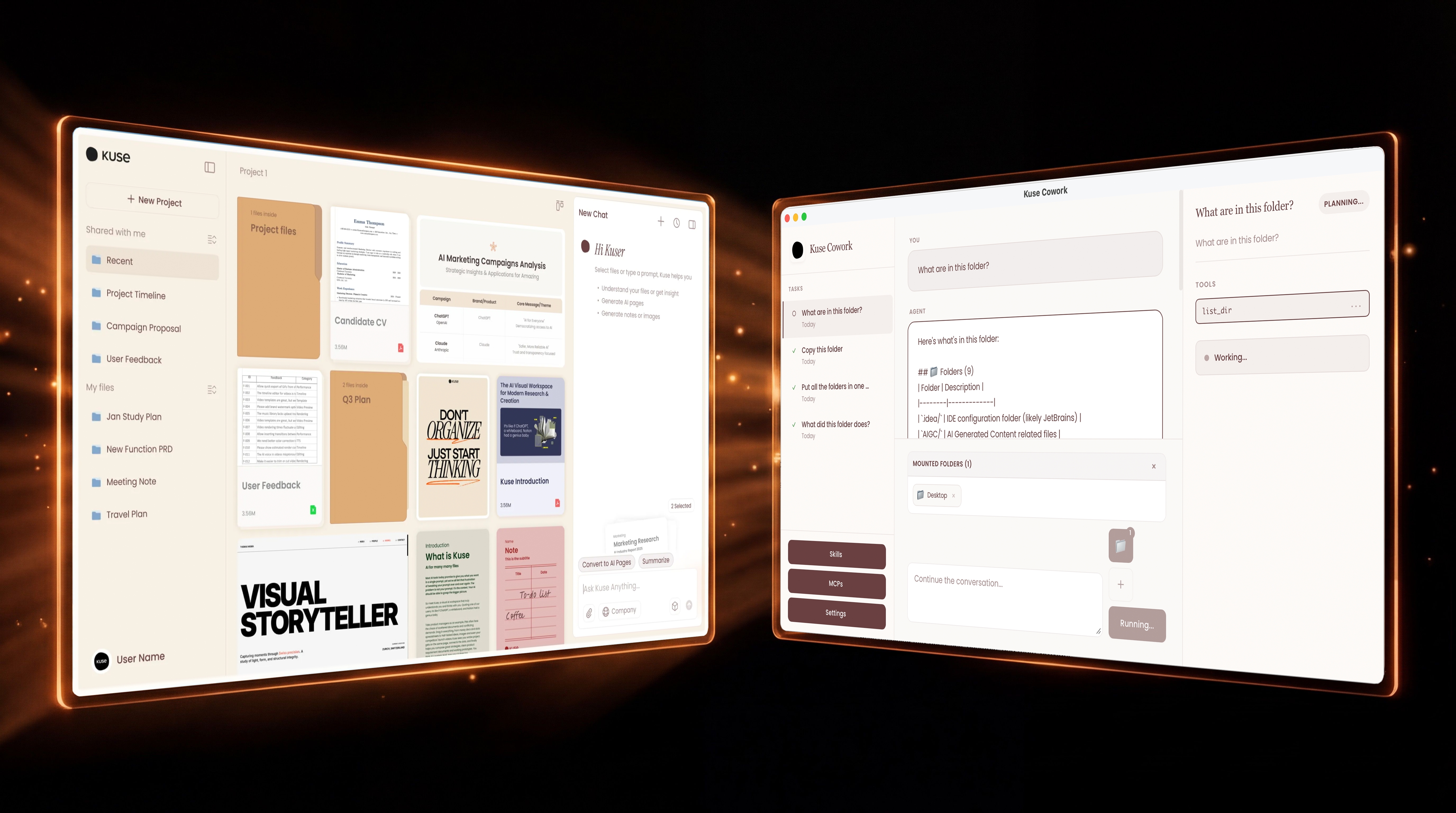 While our main platform focuses on cloud-based creative productivity, we recognize that the developer and privacy-first communities need something different: Speed, Local Control, and Extensibility. Kuse Cowork is our contribution to the ecosystem - a high-performance light-weight agent with Native Rust that brings our core philosophy to your local machine.