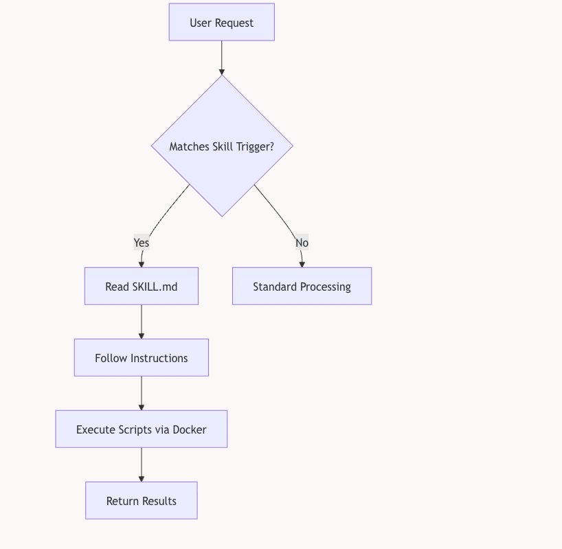/skillsin Docker - SKILL.md Parsing: Agent reads skill definitions when needed